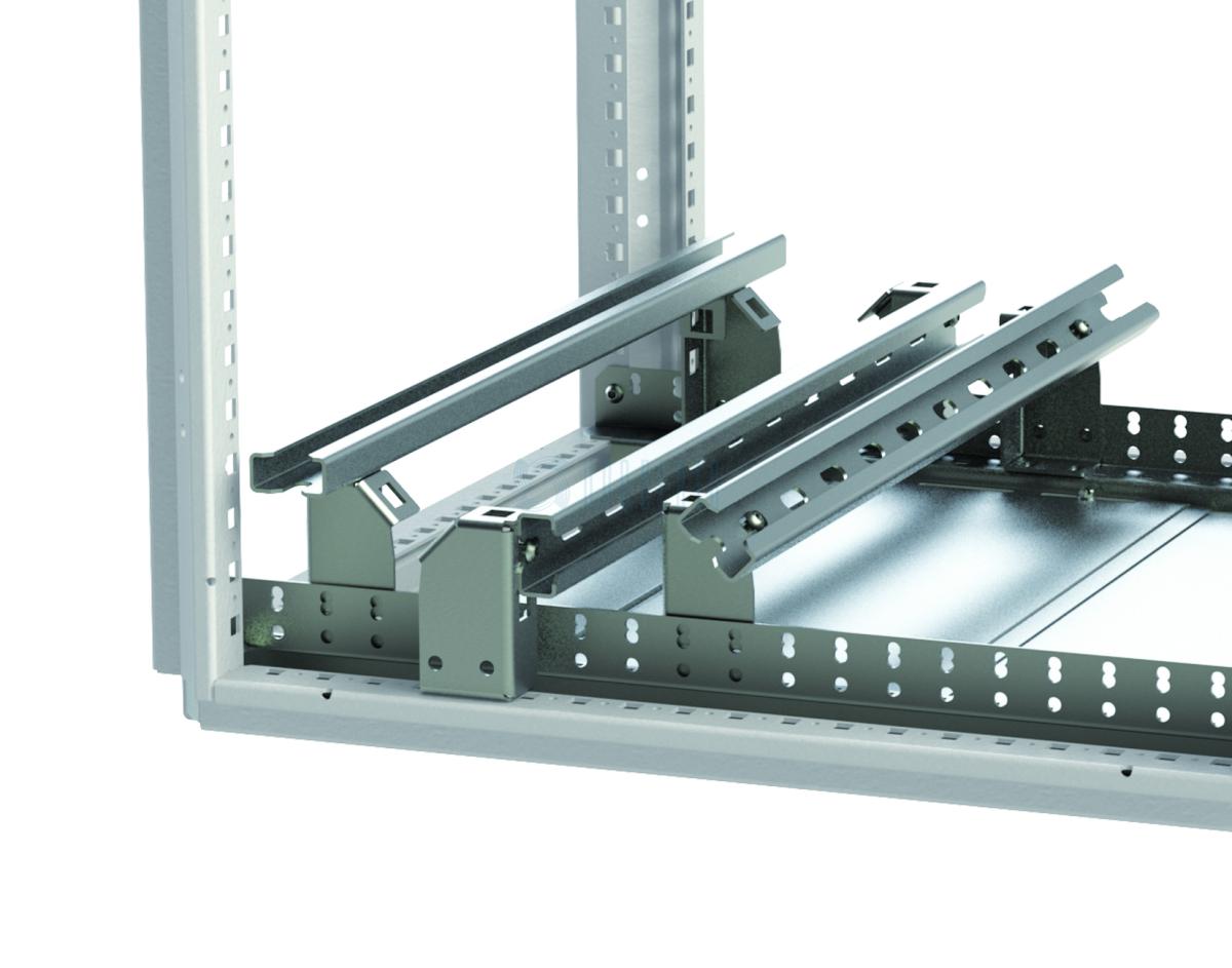 Держатель предназначен для установки монтажной траверсы под углом 45° и 90° к плоскости крепления напольного распределительного шкафа.