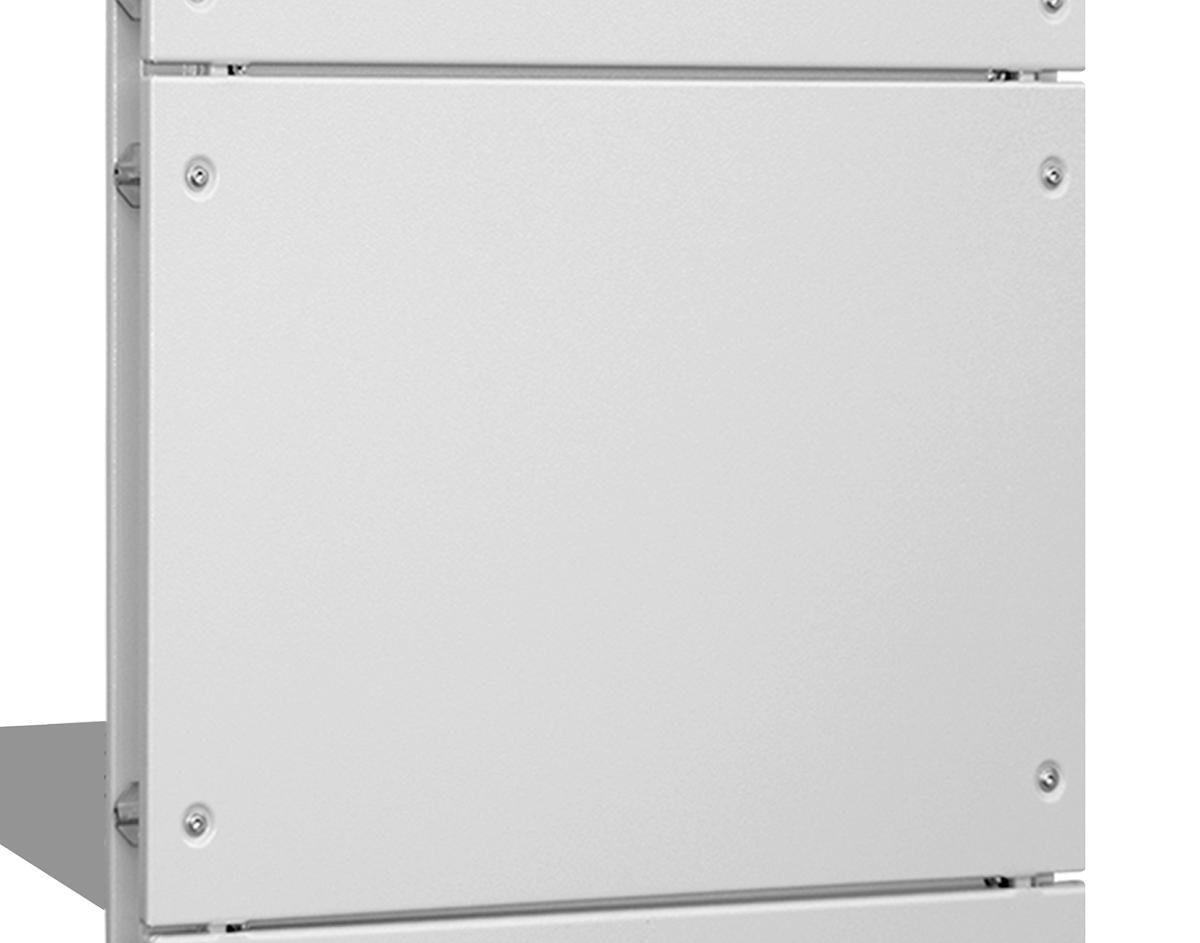 Секционные панели со смотровым стеклом или без него могут комбинироваться между собой в произвольном порядке посредством разделительных планок. На верхнем и нижнем конце требуется по одной концевой панели и одной разделительной планке. Предназначена для напольных распределительных шкафов.